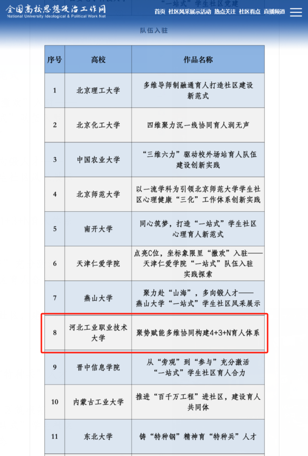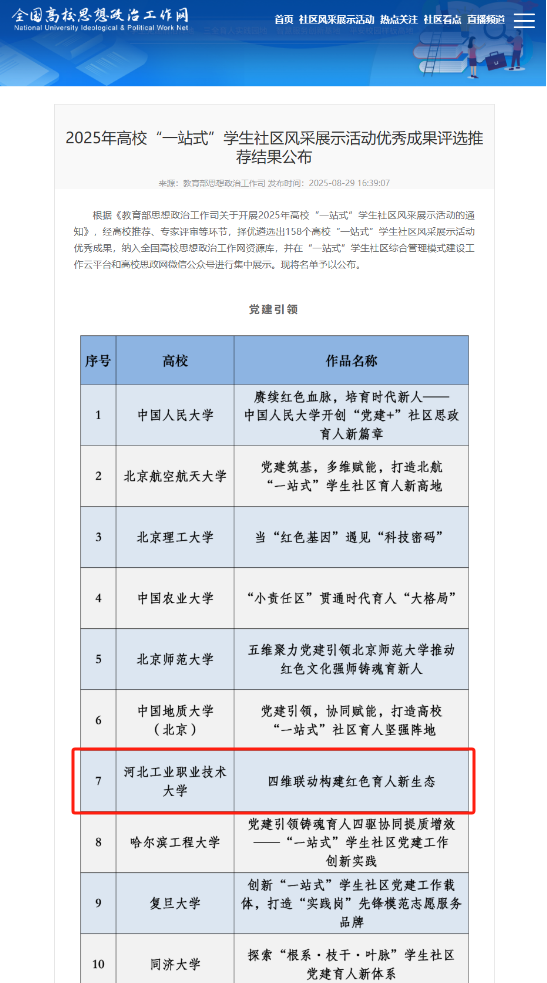 近日,教育部思想政治工作司公布了2025年高校“一站式”学生社区风采展示活动优秀成果评选推荐结果,乐玩在线社区案例《四维联动 构建红色育人新生态》获评“党建引领”模块优秀成果,《聚势赋能 多维协同 构建4+3+N育人体系》获评“队伍入驻”模块优秀成果。
