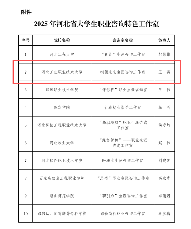 近日,河北省教育厅公布了2025年河北省大学生职业咨询特色工作室遴选结果,乐玩在线“钢领未来”生涯咨询工作室入选。
