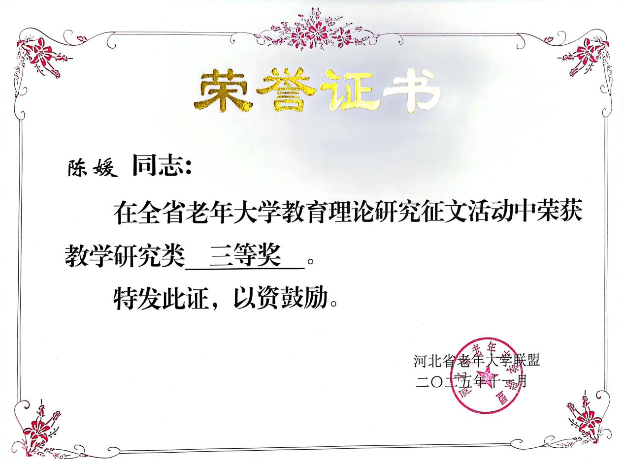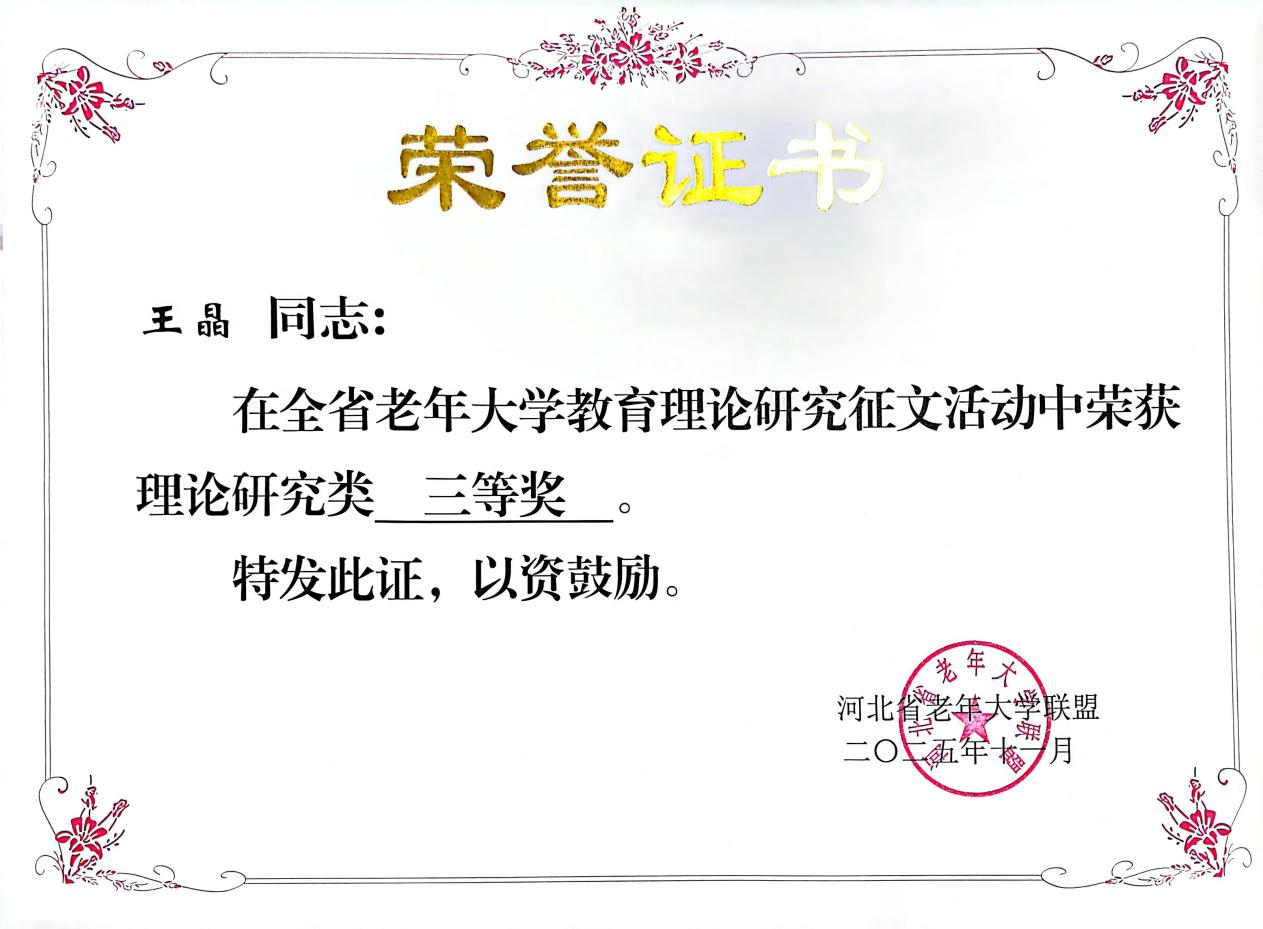 近日,河北省老年大学联盟公布了2025年老年教育理论研究征文活动评选结果,乐玩在线老年教育部王晶老师撰写的《“数字鸿沟”背景下城市社区老年智能技术教育的路径探索——特征、困境与对策》和陈媛老师撰写的《心怀大我,情暖银发:老年教育中的教育家精神探索》双双荣获理论研究类三等奖。