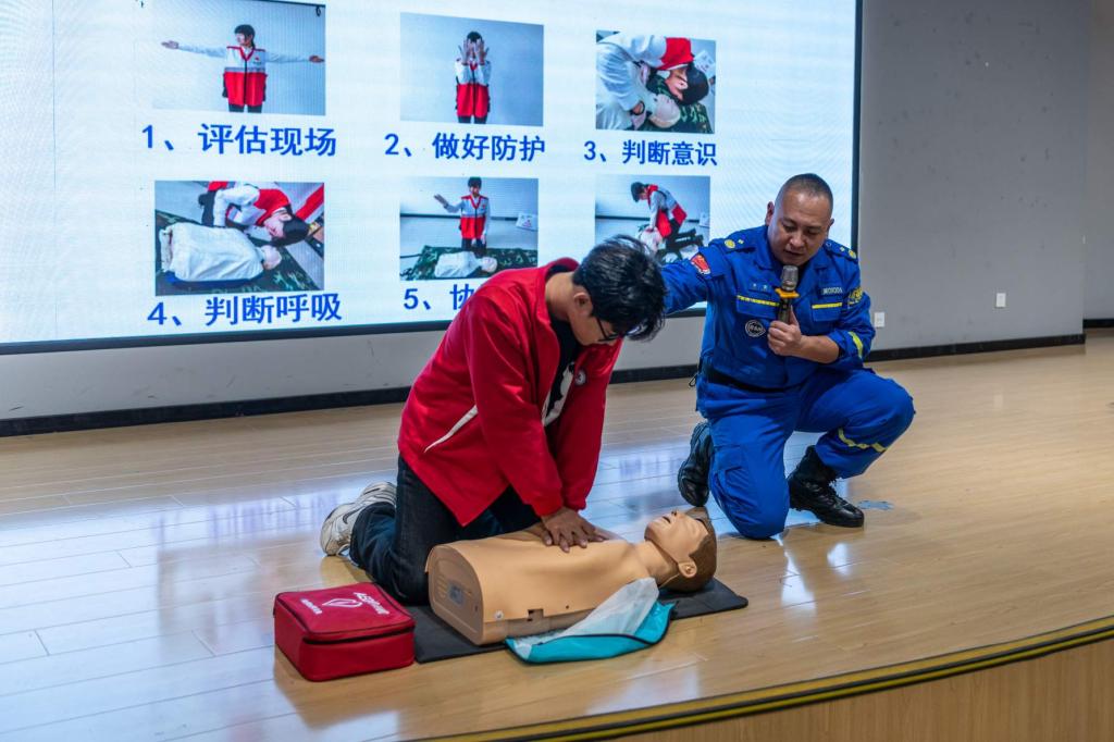 培训围绕消防基础知识、灭火器材使用、火场逃生技巧等展开系统教学,重点讲解了“提、拔、握、压”灭火器操作要领和火灾逃生的四个步骤。在应急救援环节,专业老师现场演示了海姆立克急救法、心肺复苏等关键技能,并强调了“黄金4分钟”救援时间的重要性。实操演练环节,网格员们亲身体验了灭火器使用、防尘面罩佩戴等操作。大家纷纷表示,通过此次培训不仅掌握了必备的安全技能,更增强了守护宿舍安全的责任感。