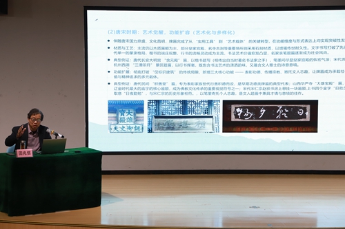 讲座伊始,田老师首先系统梳理了牌匾与碑文从先秦至近现代的演变脉络,阐释了不同历史时期的风格特征与审美流变。他结合“未央宫”匾、《泰山石刻》等典型实例,生动揭示了其从实用工具逐渐演变为文化符号的内在逻辑。随后,田老师聚焦于雕刻技艺的核心环节,完整演示了一件雕刻作品的生成过程——从选材备料、工具准备、设计定稿等前期阶段,到打轮廓、雕底子、精细修整等关键步骤,再到力度把控与线条表现等技术难点,逐步展开,层层剖析。最后,他深入分析了当前非遗传承面临的现实挑战与发展机遇,介绍了传统手艺在当代的创新实践,并鼓励同学们通过线下参观、线上学习与动手实践等多种方式参与其中,积极成为非遗文化的传播者与守护者。