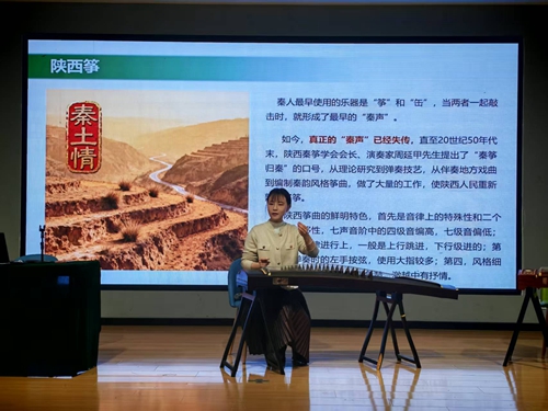 讲座中,田畅老师首先以古筝的历史演进与艺术流变为脉络,系统阐述了这一传统乐器的发展历程。她从古筝的起源与形制演变讲起,结合文献记载与实物图像,清晰展现了古筝从五弦到二十一弦的演化过程;通过对比不同时代筝曲的风格特点,生动解析了乐器结构与音色表现的内在关联。接着在流派传承环节,田老师重点介绍了我国南北古筝艺术的主要特色,并以陕西、河南、浙江等地代表性曲目为例,通过现场演奏展现了不同地域的审美追求与文化表达。整场讲解史料翔实、脉络清晰,兼具学术性与普及性。最后在理论与实践的结合方面,田老师特别展示了古筝艺术的当代传承与创新活力。她不仅演绎了《渔舟唱晚》等传统经典,更以《大鱼》等现代作品为例,演示了古筝与流行音乐的融合可能。通过与弟子的合作演奏,呈现出传统乐器在当代艺术实践中的丰富表现力。